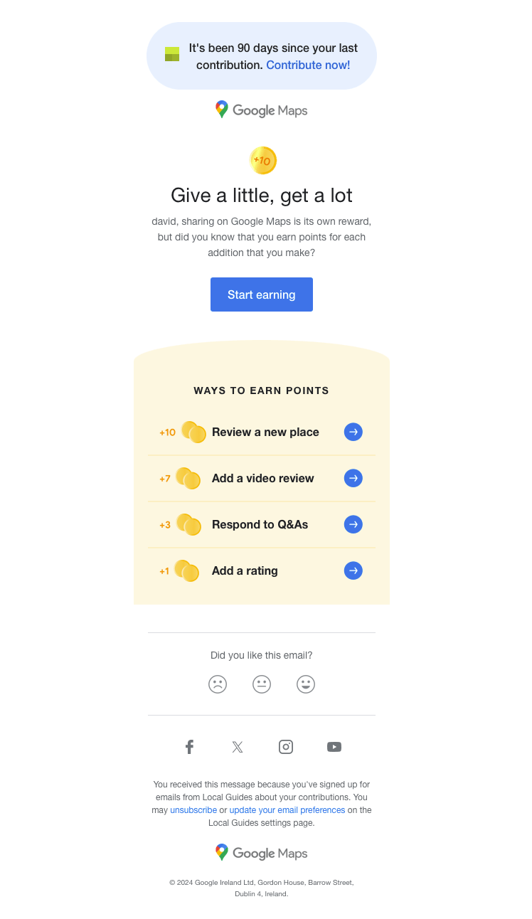 Sent after 90 days of inactivity, Google’s email encourages users to contribute to their platform, gamifying the experience by offering points for various actions.