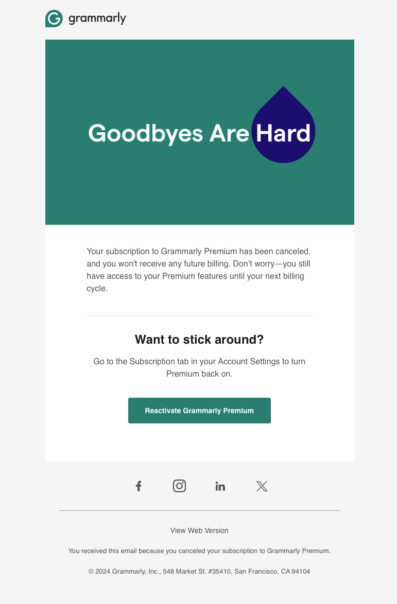 After canceling my $100/year subscription, Grammarly sent a quick email with the tagline “Goodbyes are hard.” Good start. I like it.